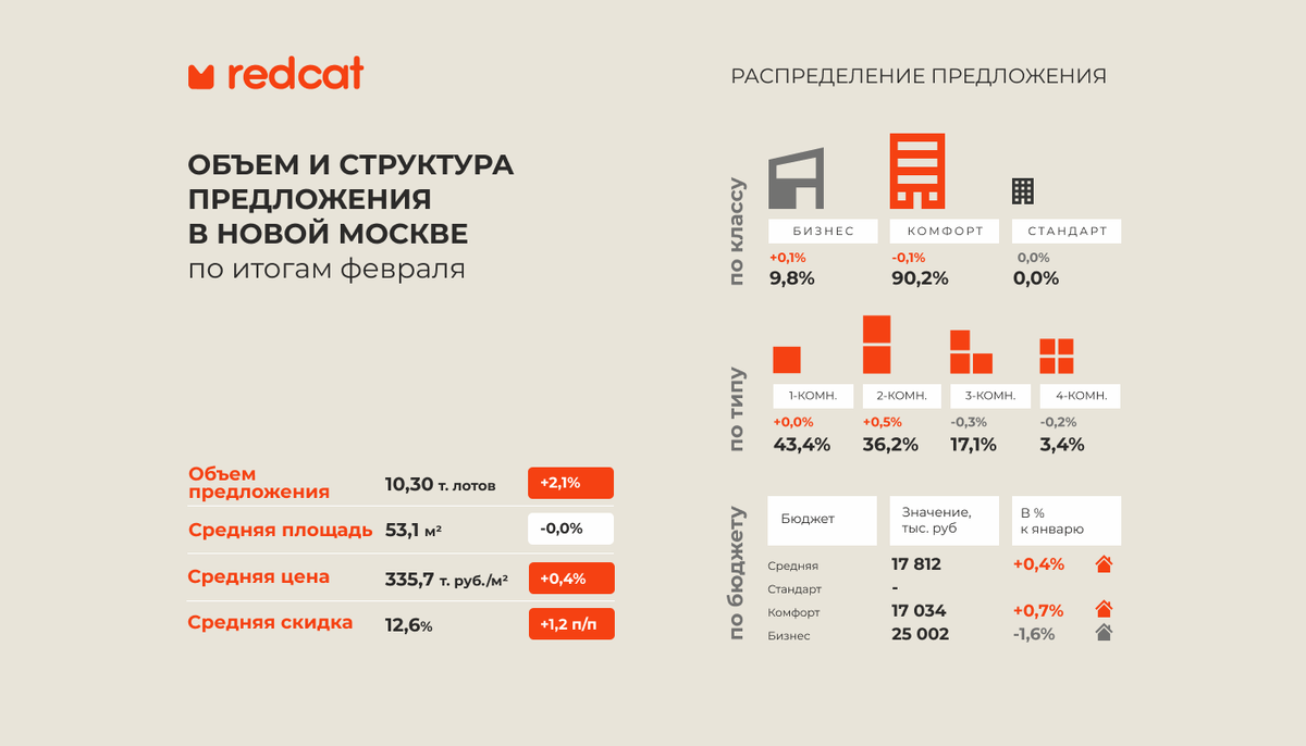 В Новой Москве в феврале на рынок вышли 2 новых корпуса, также предложение пополнялось за счет новых объемов в уже реализуемых проектах. После семи месяцев снижения, в феврале объемы предложения в Новой Москве подросли и вернулись на декабрьские уровни. Общее количество лотов, находящихся в экспозиции в феврале, выросло на 2,1%, объем предложения зафиксировался на показателе 10,3 тыс. лотов, что на 42% ниже уровня февраля прошлого года. В структуре предложения по классам в феврале произошло небольшое смещение в сторону дорогих проектов, экспозиция в бизнес-классе увеличивалась более активно, прибавив за месяц 3,1% объемов. Доля квартир бизнес-класса поднялась на 0,1 п/п и составила 9,8%, доля комфорт-класса снизилась на 0,1 п/п до уровня 90,2%. В структуре предложения по количеству комнат отмечен сдвиг в сторону двухкомнатных лотов, количество таких предложений росло более активно, чем крупных квартир. Таким образом, доля студий и 1-комн. квартир не изменилась и составила 43,4%, доля 2