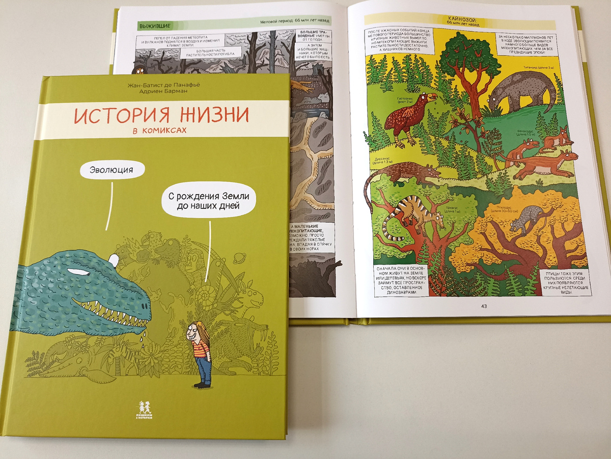 Гены, перья и юмор: секретный рецепт научпопа от доктора океанографии Жана-Батиста де Панафье. Книга «История жизни в комиксах» — это масштабный графический путеводитель по истории Земли, охватывающий период более 4 миллиардов лет: от момента формирования планеты до появления современного человека. Книга объясняет сложные процессы естественного отбора и биологического разнообразия в доступной визуальной форме. Основные темы и сюжетные линии Зарождение жизни: книга начинается с первых микроскопических «пузырьков» и бактерий, способных выживать в экстремальных условиях без кислорода. Ключевые эволюционные скачки: автор подробно останавливается на переломных моментах, таких как появление первого яйца в твердой скорлупе, выход животных на сушу и возникновение полета. Великие вымирания: описаны глобальные катаклизмы, ледниковые периоды и массовые потепления, которые радикально меняли облик планеты. Галерея предков: на страницах появляются древние рыбы, первые наземные растения, динозавры, г