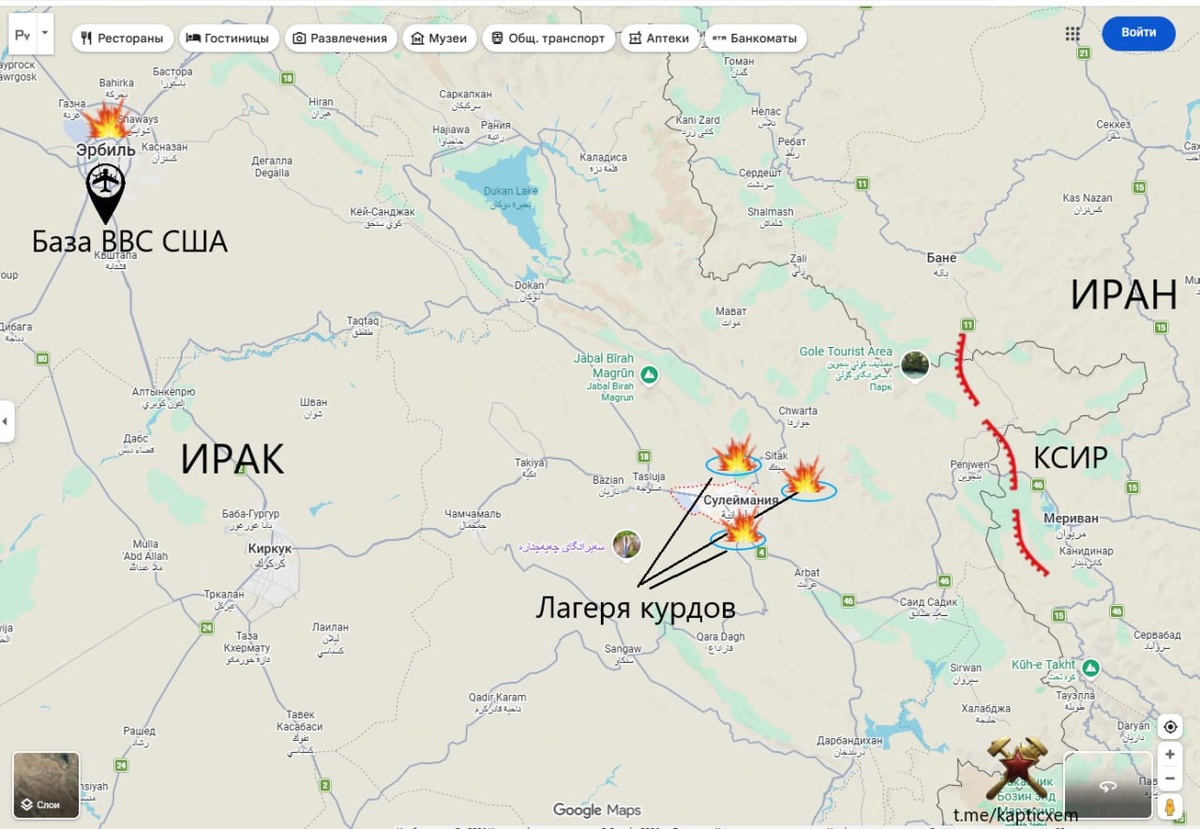 с запада, что началось вторжение, пока не почувствуют, что персы явно проигрывают, а вот войти тогда и пограбить милое дело. Курдские племена сотни лет промышляли разбоем и наемничеством, оспаривая транзитные потоки с турками, персами и арабами, так сложилось исторически. Сейчас по их полевым лагерям наваливают ракетами в Сулеймании, а так же по базе США в Эрбиле. Курдские атаманы хорошо понимают, как только они войдут в Иран и увязнут в боях с Корпусом стражей, им тут же в тыл ударит иракское ополчение и вырежут всех. схемы и карты