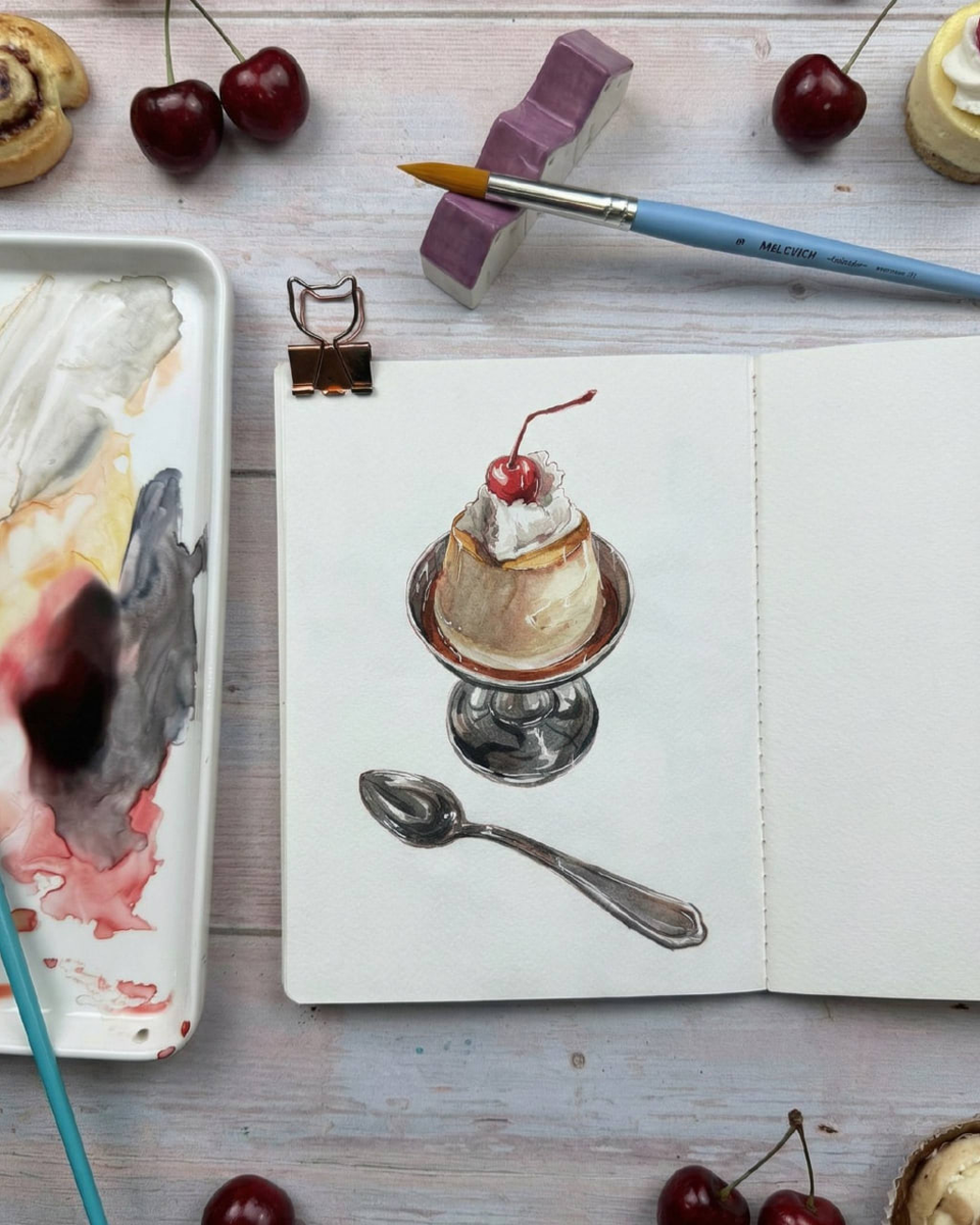 💫 Встречайте второй урок марафона "Из Кореи с десертом"! Сегодня приглашаем вас нарисовать акварельный скетч с аппетитным пудингом 🍨 В этом уроке вас ждет работа с текстурой металла, и, конечно, создания аппетитного десерта 🍒 👀 Партнер марафона - компания Малевичъ, товары для художников (http://t.me/maleviches_brand), вы увидите материалы этого бренда в работе, а потом еще и выиграть что-то для себя в розыгрыше 🎁