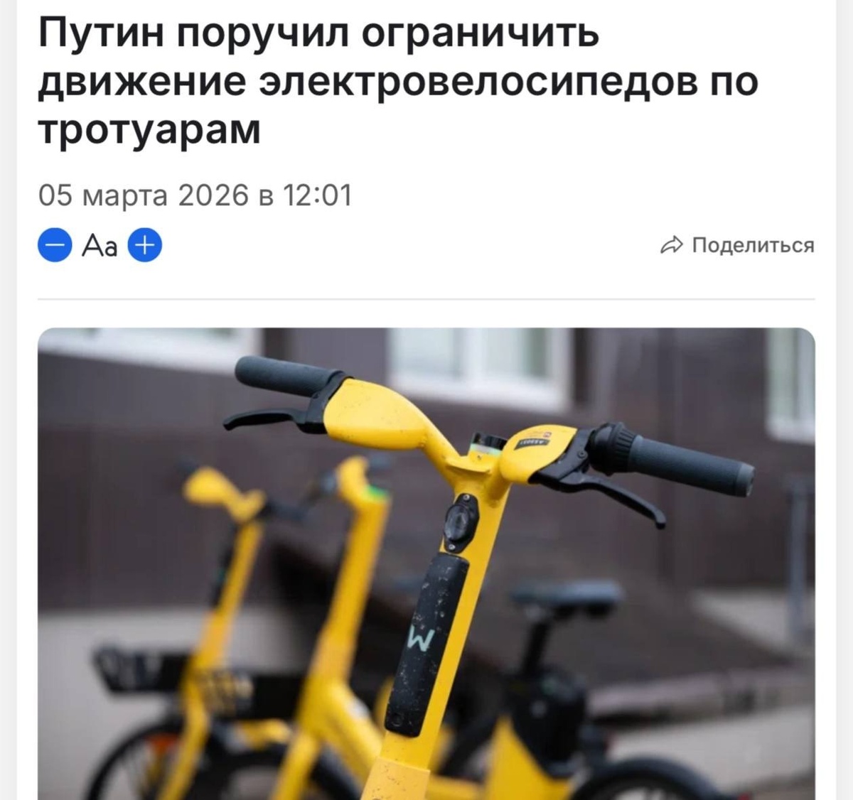 Электросамокатчикам запретят ездить по тротуарам: Путин поручил Минтрансу и МВД рассмотреть вопрос об ограничении движения СИМ и электровелосипедов по пешеходным дорожкам.
