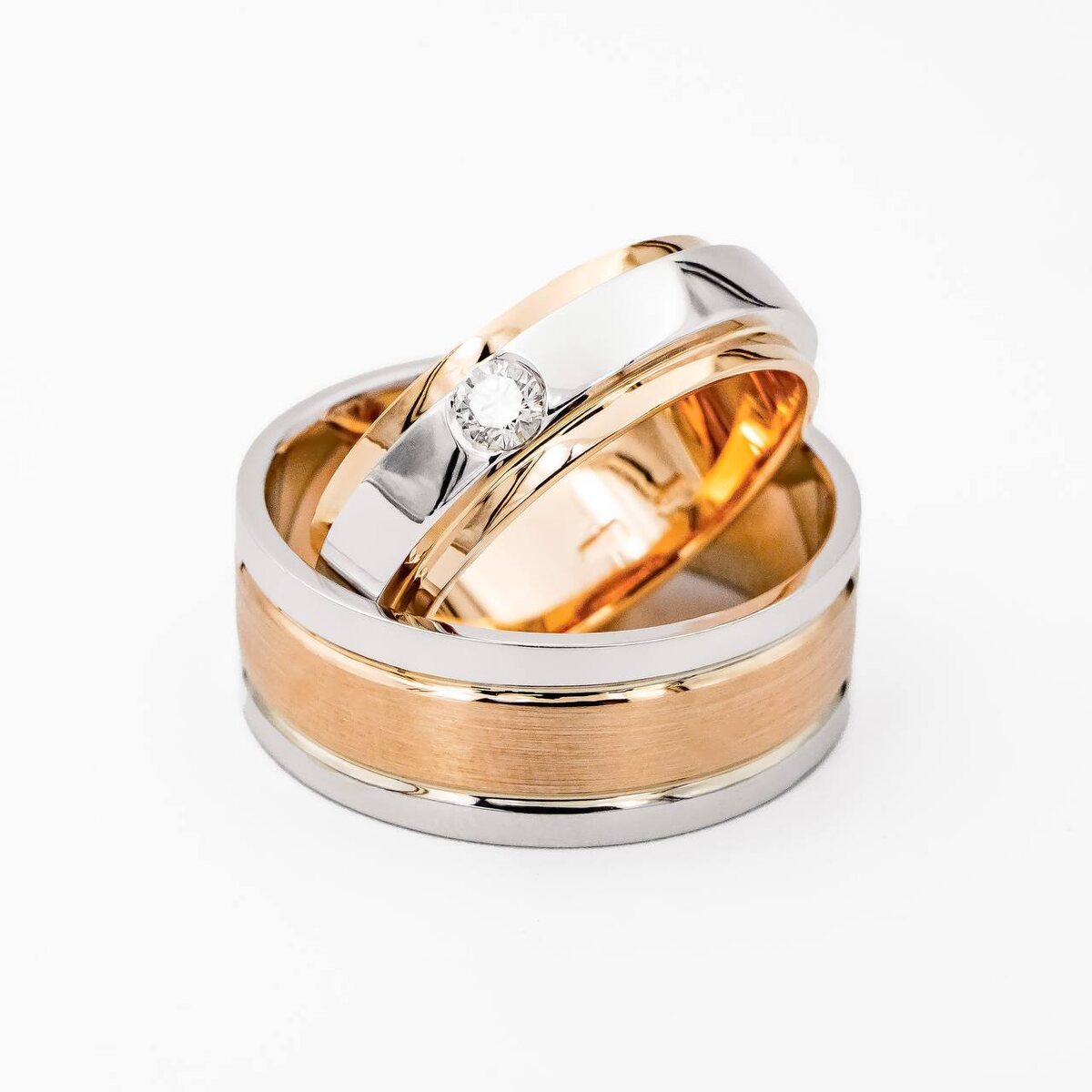 Мужская модель отличается лаконичностью и матовой фактурой, обрамленной глянцевыми кантами. Женское кольцо дополнено изящным акцентом, бриллиантом, который эффектно сияет на стыке двух металлов.