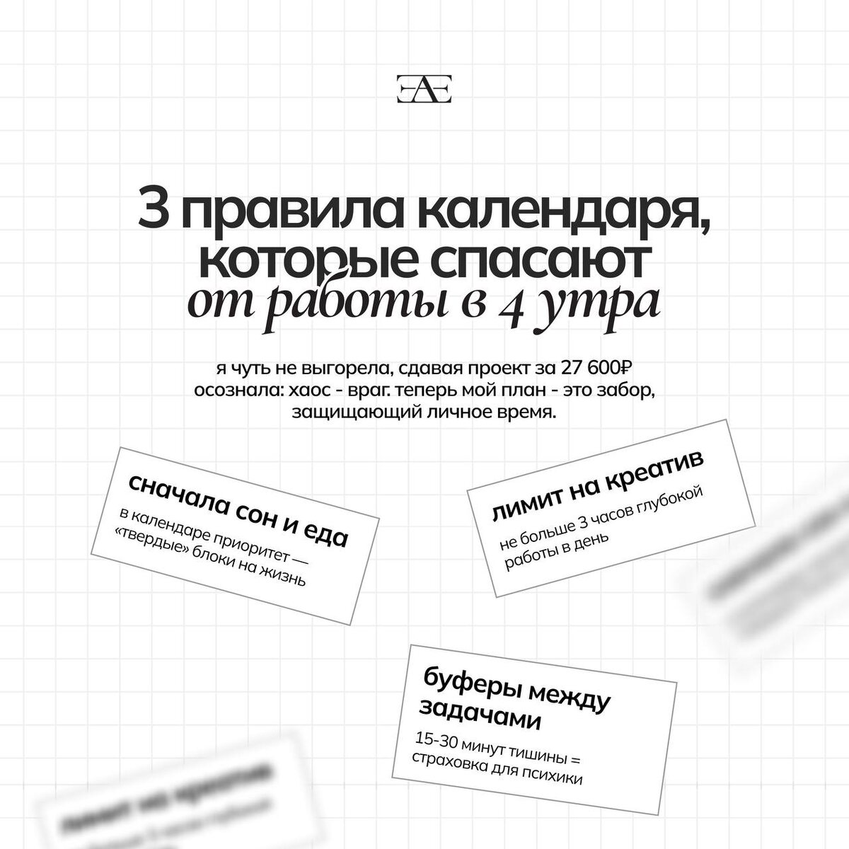 У клиента был запуск, сроки горели, и я не спала сутки. В какой-то момент, понимая, что отключаюсь прямо за столом, я написала заказчице: «Пожалуйста, позвони мне ровно в 4:00 и буди, пока я не возьму трубку». Я легла на два часа, чтобы потом снова сесть за макеты. Это была моя самая дорогая презентация на тот момент - 27 600 рублей. Огромные деньги, куча слайдов, тонна правок. Но знаете, какой был итог? Из-за состояния зомби в проекте оказался миллион нелепых ошибок, которые я потом переделывала еще несколько дней. Эта сумма не стоила того физического ада, когда тебя буквально тошнит от усталости. Именно тогда ко мне пришло осознание: мой «героизм» - это просто отсутствие системы. Если ты работаешь до потери пульса, значит, ты не умеешь управлять своим ресурсом. Я до сих пор борюсь с установкой «если я не занята делом до тошноты, значит, я недостаточно стараюсь». Но сейчас я вытаскиваю себя из этого хаоса с помощью структуры. Чтобы не доводить до состояния «разбуди меня в 4 утра»,