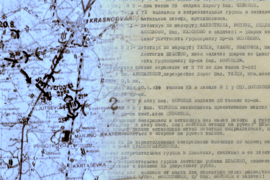 Первый документ датируется 20 августа 1941 года, время — 21.30. Согласно этому документу у совхоза Войсковицы подбито два танка: