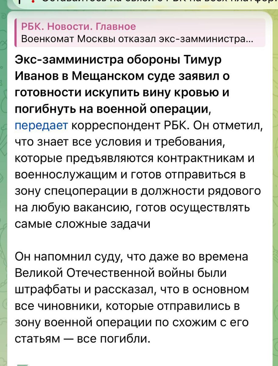 Не в первый уже раз Тимур Иванов откровенно глумится над судебной системой и всеми теми, кто воюет на фронте. Первое. Если допустить, что он говорит искренне, то получается, что транслирует следующую мысль: «лучше умереть, чем жить нищим в СИЗО». Ты воровал, по этой причине сотни, тысячи людей были ранены и погибли на войне, и ты предлагаешь «искупить» это поездкой своей бесценной персоны на войну? Интересно, как это поможет? И второе. Верить в то, что говорит Тимур Иванов может только очень замотивированный человек. Новые территории — это место, где можно, имея деньги и связи, надолго «потеряться». И конечно, умирать там никто не собирается.