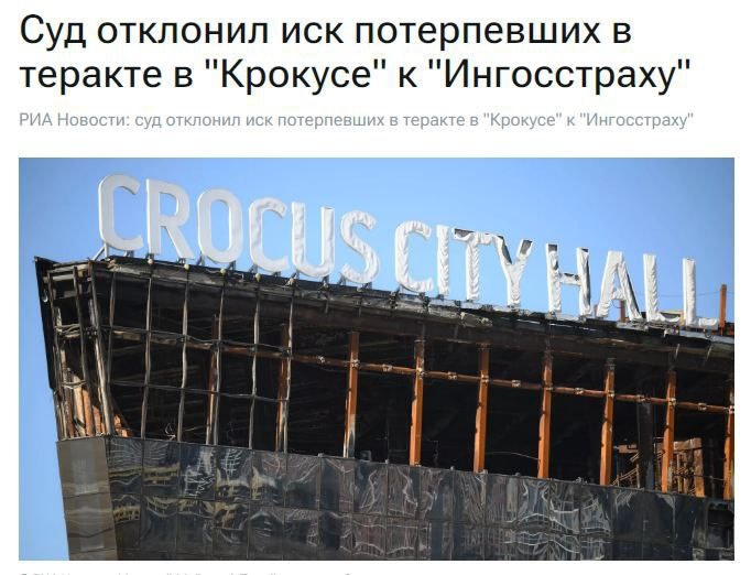" Истцы просили суд установить факт наступления страхового случая для получения выплат по договору страхования гражданской ответственности, заключенному между АО "Крокус Интернешнл" и СПАО "Ингосстрах". Как ранее в суде заявили представители "Ингосстраха", риск теракта не был включен в договор страхования с "Крокусом". 😏 Брекотин. Подписаться 🇷🇺 Брекотин в MAX