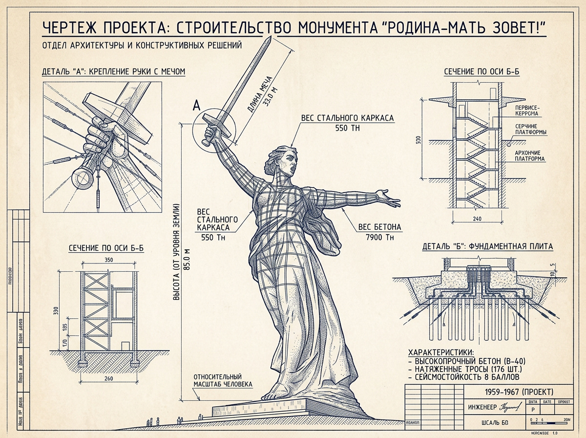 Строительство началось спустя 14 лет после войны: город долго залечивал раны, лишь в конце 50-х специалисты приступили к возведению гиганта. Скульптуру строили монолитным способом, используя тот же бетон, что и при возведении Волжской ГЭС — это был высокотехнологичный проект своего времени: на момент завершения «Родина-мать» стала самой высокой статуей в мире, попав в Книгу рекордов Гиннесса. Высота фигуры составляет 52 метра, а вместе с мечом — целых 85. Чтобы удержать такую массу, инженеры применили уникальную систему: скульптура стоит на фундаменте под собственным весом (!), но внутри нее спрятан настоящий стальной скелет — система канатов, каждый из которых натянут с силой в 60 тонн. За их состоянием следят с ювелирной точностью: датчики снимают показания каждые десять дней, и при необходимости натяжение корректируется.