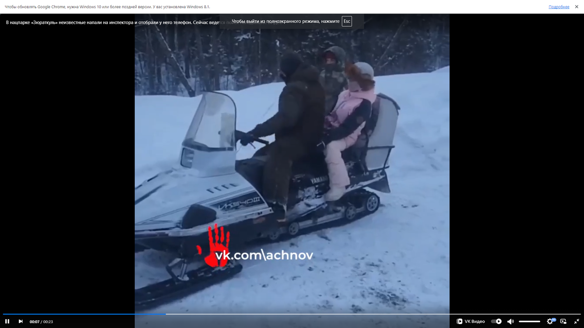 Сейчас ведется поиск нападавших. ВИДЕО Инцидент произошел на кордоне «У трех вершин». Как рассказали в нацпарке, компания из трех мужчин и трех женщин ехала на снегоходах со стороны ледяного фонтана. Инспектор парка сделал им замечание: передвигаться по территории на мототехнике строго запрещено законом. В ответ нарушители начали материться и набросились на сотрудника — вырвали у него из рук телефон и скрылись в сторону трассы Меседа — Тюлюк. Сейчас полиция ищет нападавших. А в национальном парке напоминают: снегоходы пугают зверей (лосей, медведей, рысей), мешают им зимовать и мигрировать, а еще создают аварийные ситуации для туристов на лыжных маршрутах. Штраф для нарушителей — до 500 тысяч рублей, а если природе нанесут ущерб, могут завести и уголовное дело. Если вам что-то известно об этих людях – звоните в полицию или по номерам: 8-993-545-34-04; 8-902-897-25-77.