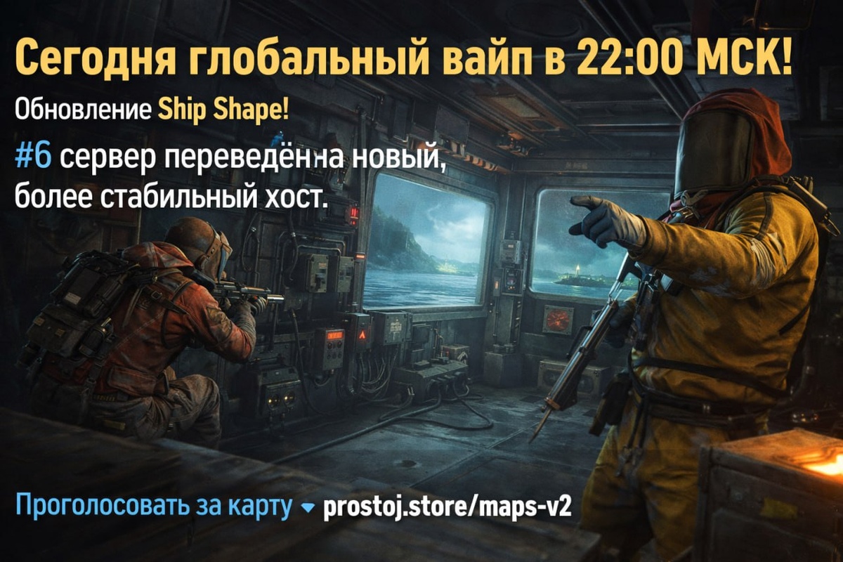 ! Выходит обновление Ship Shape: на кораблях появится электричество, промышленность, ловушки и обои, изменится цикл дня и ночи, а Deep Sea будет открываться случайно. ⚙️ #6 сервер переведён на новый, более стабильный хост. 🗺 Проголосовать за карту: https://prostoj.store/maps-v2 Вайп на всех серверах, кроме #7 X3 — там он будет в понедельник.