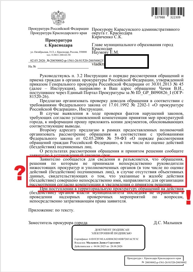 Однако, 02.03.2026 мною получен ответ заместителя прокурора города Краснодара Малышева Д.С. № 200030002-р-1561-26/81520-200300021, который, вместо проведения проверки и принятия мер реагирования, в нарушение всех норм законодательства, вновь перенаправил мою жалобу - прокурору Карасунского административного округа г. Краснодара Кириченко С.К. и главе муниципального образования город Краснодар Наумову Е.М., на администрации и ее ненужную прослойку – УЖВ администрации я неоднократно подавал жалобы.