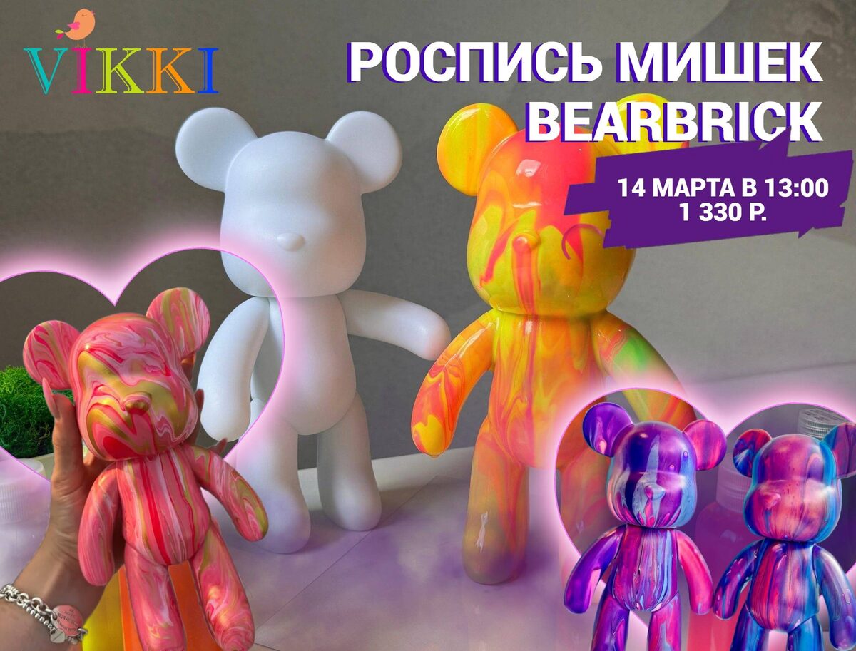 На мастер-классе вы научитесь расписывать фигурку мишки Bearbrick в индивидуальной цветовой гамме с использованием различных техник: роспись акриловыми красками, флюид арт, поталь и эмаль. Все материалы предоставляются, мастер объяснит нюансы работы Начало: 14 марта 2026 13:00 Стоимость: 1330.0 руб. Адрес: г Омск, Бульвар Зеленый, 4 Организатор: https://vk.com/public213321968 🔥 NEW! Мастер-класс от VIKKI!🔥 🎁 14 МАРТА с 13:00 – NEW Мастер-класс "Роспись трендового мишки Bearbrick": как за час превратить обычную фигурку в модный сувенир, который приятно подарить друзьям или оставить себе? На этом мастер-классе мы расписываем мишку размера 23 см с вашей индивидуальной цветовой гаммой, принтом и узором❗ В вашем распоряжении различные техники... #искусство_и_дизайн_рисование_(графика) Узнать подробности, адрес или записаться на событие.