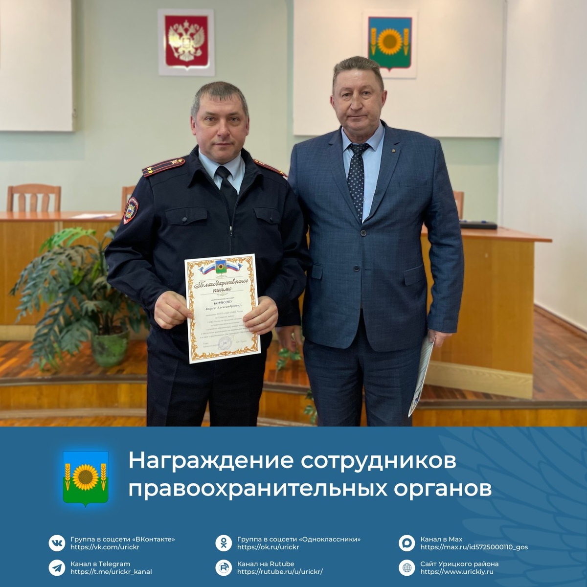 ОМВД по Урицкому району — Андрею Борисову, Павлу Сеину, Юрию Новикову, а также сотруднику отделения Госавтоинспекции по Урицкому району Алексею Ветрову. Награждение стало признанием их профессионализма и значительного вклада в обеспечение правопорядка и безопасности на территории района. #УрицкийРайон #АдминистрацияУрицкогорайонаОрловскойобласти