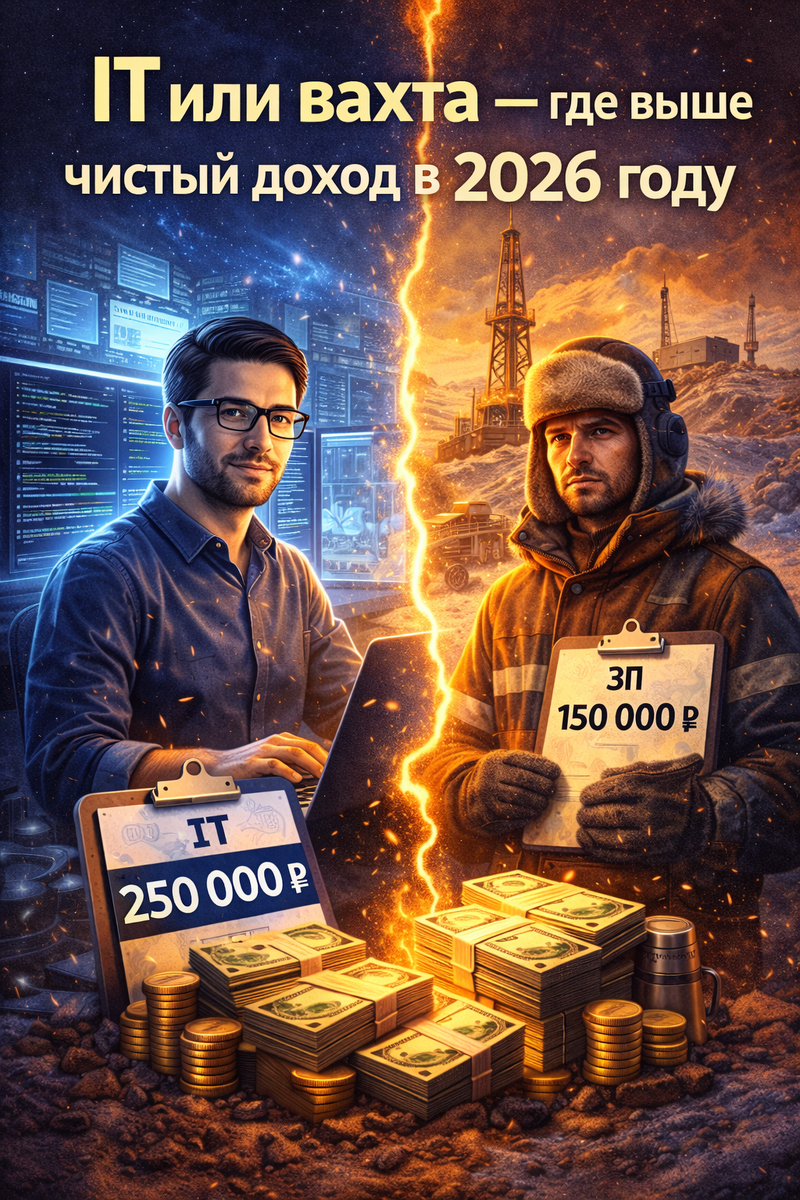 Когда речь заходит о высоких зарплатах, чаще всего вспоминают две совершенно разные сферы. С одной стороны — IT, где программисты и аналитики могут получать сотни тысяч рублей. С другой — вахтовая работа на Севере, где тоже обещают зарплаты 200–300 тысяч. На первый взгляд кажется, что это две дороги к одинаковым деньгам. Но если копнуть глубже, возникает главный вопрос: где на самом деле выше чистый доход? Несмотря на огромную разницу между профессиями, у них есть несколько общих черт. И IT, и вахта обещают: Поэтому многие люди, которые хотят изменить финансовое положение, рассматривают именно эти варианты. Но условия работы и путь к доходу в этих сферах совершенно разные. Сначала посмотрим на IT. Обычно зарплаты в этой сфере зависят от опыта. После курсов или первых проектов зарплаты обычно находятся в диапазоне: 70 000 – 120 000 ₽ Иногда меньше, если человек только начинает карьеру. Через 2–4 года работы многие специалисты выходят на уровень: 150 000 – 250 000 ₽ Это уже стабильный у