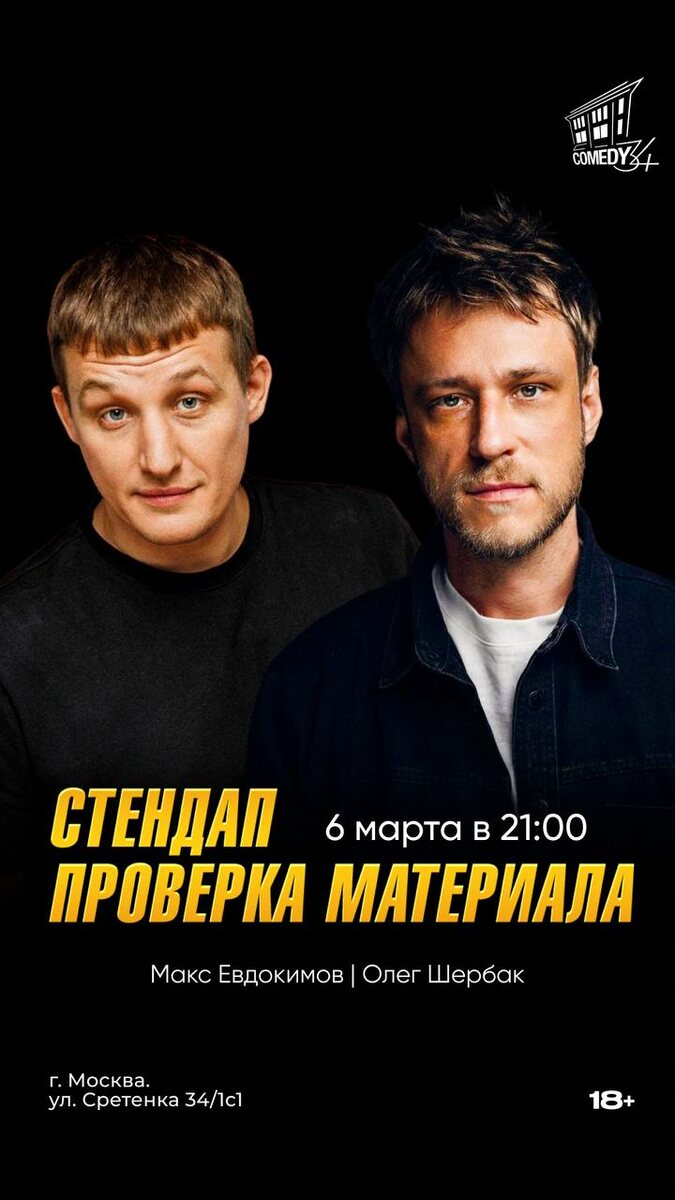 Два крутых комика со своими лучшими шутками Приходи ощутить дружескую атмосферу и посмеяться 🤩 Макс Евдокимов и Олег Щербак 🤩 06 Марта 21:00 🤩 Comedy34 ул.Сретенка 34/1с1 🤩 Билеты