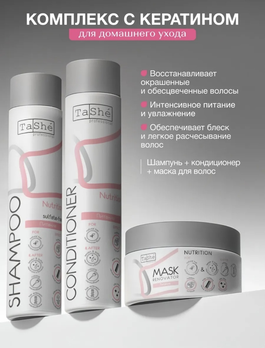 Продукты от TaShe из линейки Nutrition работают как базовый салонный уход дома. Шампунь мягко очищает кожу головы, не пересушивая длину. Кондиционер закрывает кутикулу волоса, делает волосы гладкими и облегчает расчёсывание. Маска же работает глубже: питает, восстанавливает и возвращает плотность волосам.