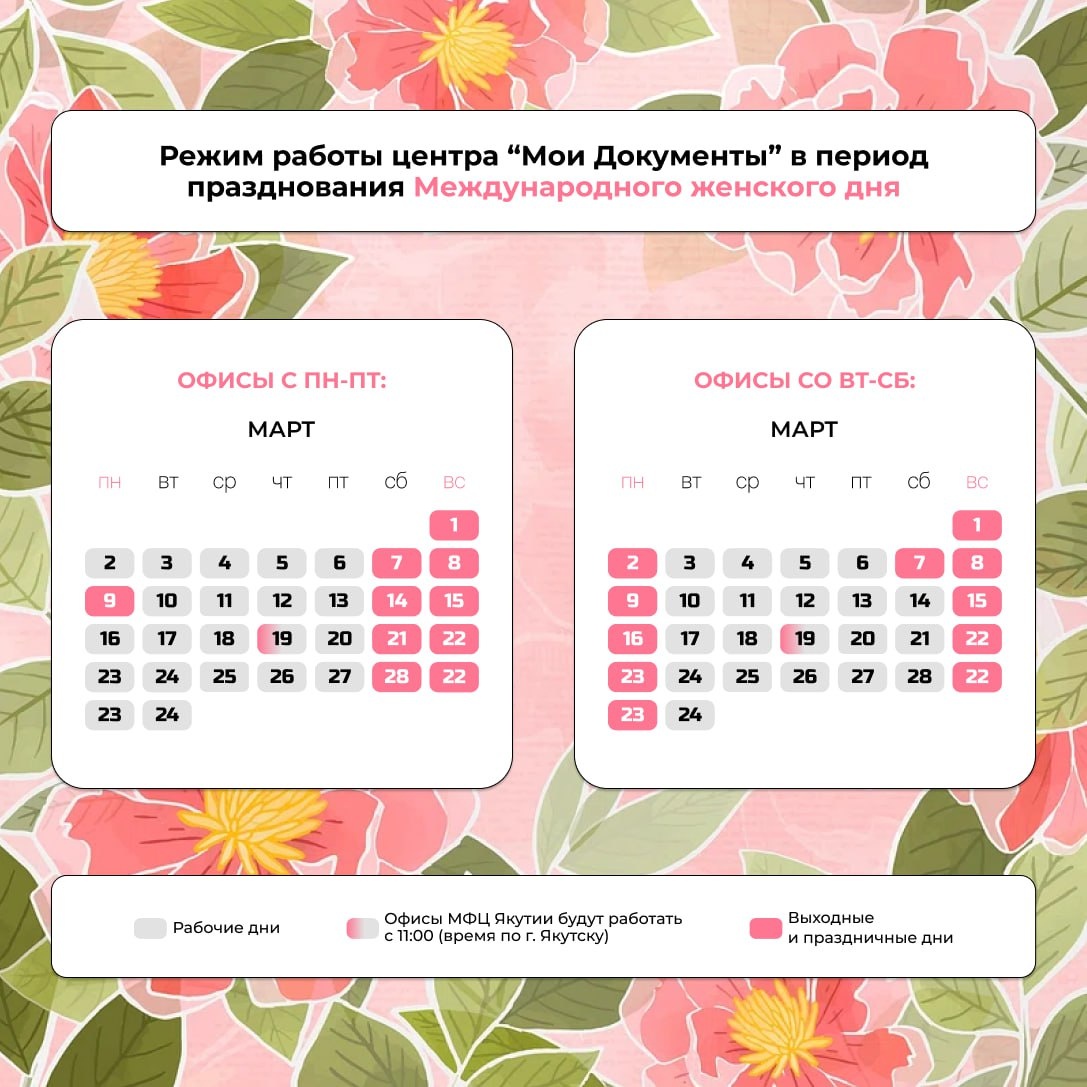 👆 🔔Внимание: у отделений разные режимы работы - некоторые офисы работают с понедельника по пятницу, а другие со вторника по субботу. Просим учесть при планировании визита в центр "Мои Документы". 💬Офисы с пн-пт: 📍г. Якутск: ➡️Аммосова, д. 18 ➡️Ярославского, д. 37 ➡️Лермонтова, д. 123 ➡️Госфонд 📍Районные отделения: ➡️Томмот ➡️Пеледуй ➡️Майя ➡️Белая Гора ➡️Чокурдах ➡️Амга ➡️Саскылах ➡️Тикси ➡️Верхневилюйск ➡️Зырянка ➡️Батагай ➡️Вилюйск ➡️Бердигестях ➡️Жиганск ➡️Сангар ➡️Кобяй ➡️Нюрба ➡️Витим ➡️Нижний Бестях ➡️Намцы ➡️Черский ➡️Усть-Нера ➡️Томтор ➡️Олекминск ➡️Оленек ➡️Среднеколымск ➡️Сунтар ➡️Ытык-Кюель ➡️Хандыга ➡️Борогонцы ➡️Депутатский ➡️Покровск ➡️Мохсоголлох ➡️Чурапча ➡️Батагай-Алыта ➡️Удачный 💬Офисы со вт-сб: 📍г. Якутск ➡️пр. Михаила Николаева, д. 44 ➡️Жорницкого, 30/1 ➡️203 мкр., корп. 10 📍Районные отделения: ➡️Алдан ➡️Жатай ➡️Ленск ➡️Айхал ➡️Мирный ➡️Нерюнгри ➡️Также напоминаем, что 19 марта 2026 года офисы центра "Мои Документы" будут работать с 11:00 (время по