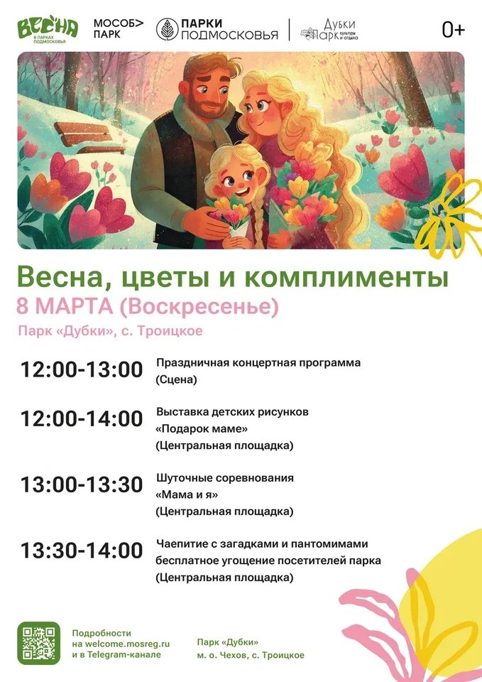 ✨ Отмечаем 8 Марта в парке Дубки 🎤12:00-13:0 Праздничная концертная программа 🖼️12:00-14:00 Выставка детских рисунков «Подарок маме». 👉13:00-13:30 Шуточные соревнования «Мама и я». Эстафеты и конкурсы для детей и родителей. ☕️13:30-14:00 Бесплатное чаепитие с загадками и пантомимами. 🚫 Возраст: 0+ 📆 08.03.2026 🕛 12:00 🏢 Парк культуры и отдыха «Дубки» 📍 г.о.Чехов, с.Троицкое, парк "Дубки" 🪙 Вход свободный❗️ ⭐Поддержать канал голосом ✅ Мероприятия Чехов https://dzen.ru/id/66cc4b48e9ef144699238a51 https://vk.ru/chekhov_events http://dzen.ru/chekhov_events