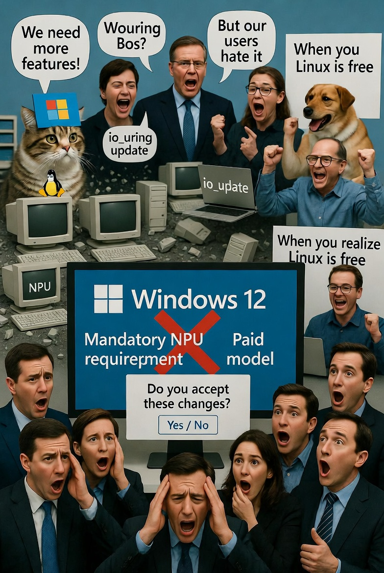 Привет! Microsoft снова решила, что пора всех загнать в новый загон под названием «купи свежий комп или плати ежемесячно за воздух». Слухи о Windows 12 (или как там её теперь зовут внутри — Hudson Valley Next, CorePC, AI-Overlord Edition) кипят так, будто кто-то разлил кофе на серверы утечек. И да, пора уже паковать чемоданы на Linux, потому что этот цирк с NPU за 40 TOPS и подписками пахнет не обновлением, а чистым разводом на бабки. Представьте: ваша любимая Windows 10 (или даже 11, если вы мазохист) в октябре 2025-го уже на пенсии, апдейты безопасности кончаются, хакеры трут ручки. А тут бац — выходит «Windows 12» где-то к концу 2026-го, и чтобы она вообще завелась нормально, нужен процессор с нейромодулем (NPU), который выдаёт минимум 40 триллионов операций в секунду. Это не шутка: Intel Core Ultra и AMD Ryzen AI свежих поколений еле-еле дотягивают или переваливают через эту планку, а всё, что старше пары лет — в пролёте. Нет такого NPU? Получите либо урезанную версию без половины