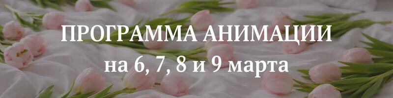 🤩 Программа на 6 марта ✔️ с 16:00 до 16:45 «Фиолетово». Игры для детей. ✔️ с 17:00 до 17:45 «Кто я?» детская творческая игра. ✔️ с 20:00 до 20:45 «Антигрустинка» детская дискотека. ✔️ с 21:30 до 23:00 караоке для гостей отеля. Программа на 7 марта ✔️ с 11:00 до 11:45 «Чьи это следы?». Детская поисковая игра и увлекательная прогулка по следам героев любимых мультфильмов. ✔️ с 12:30 до 13:15 «Рыцарский турнир». Игровой мастер-класс: создаём фигурки лошадок и участвуем в настоящем рыцарском состязании. ✔️ с 16:00 до 16:45 «Резиночки». Семейный чемпионат по знаменитой дворовой игре. ✔️ с 17:00 до 17:45 «Фасоль». Детское караоке для юных звёзд сцены. ✔️ с 20:00 до 20:45 «На стиле». Анимационная программа с Барби и Кеном — школа моды для юных модников. ✔️ с 21:30 до 23:00 вечерний диджей-сет Программа на 8 марта ✔️с 11:00 до 11:45 «Солнце ТУСА». Утренняя семейная программа с яркими играми и солнечным настроением. ✔️ с 12:30 до 13:15 «Бьюти-бар». Детский мастер-класс по глиттер-т