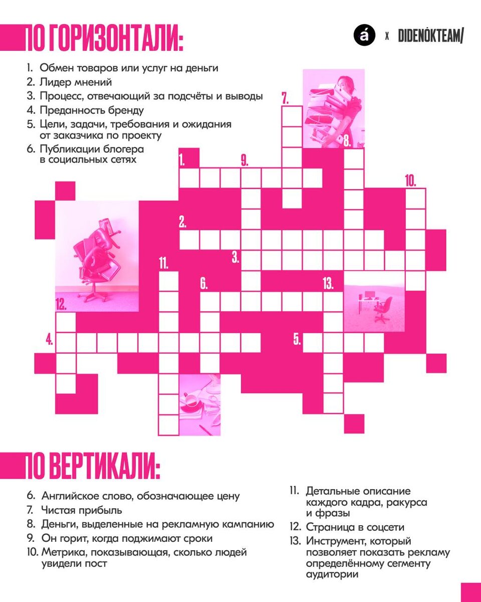 🫡 Мы вместе с телеграм-каналом гура́ составили маркетинговый кроссворд на радость любителям ретро-развлечений. Не открывайте вторую карточку сразу, там ответы! Ждём от вас разгаданный кроссворд в комментариях ✨ (Он составлен при поддержке три в ряд, судоку и поездки в поезде без интернета) 🩷 Подписаться на DIDENOK TEAM