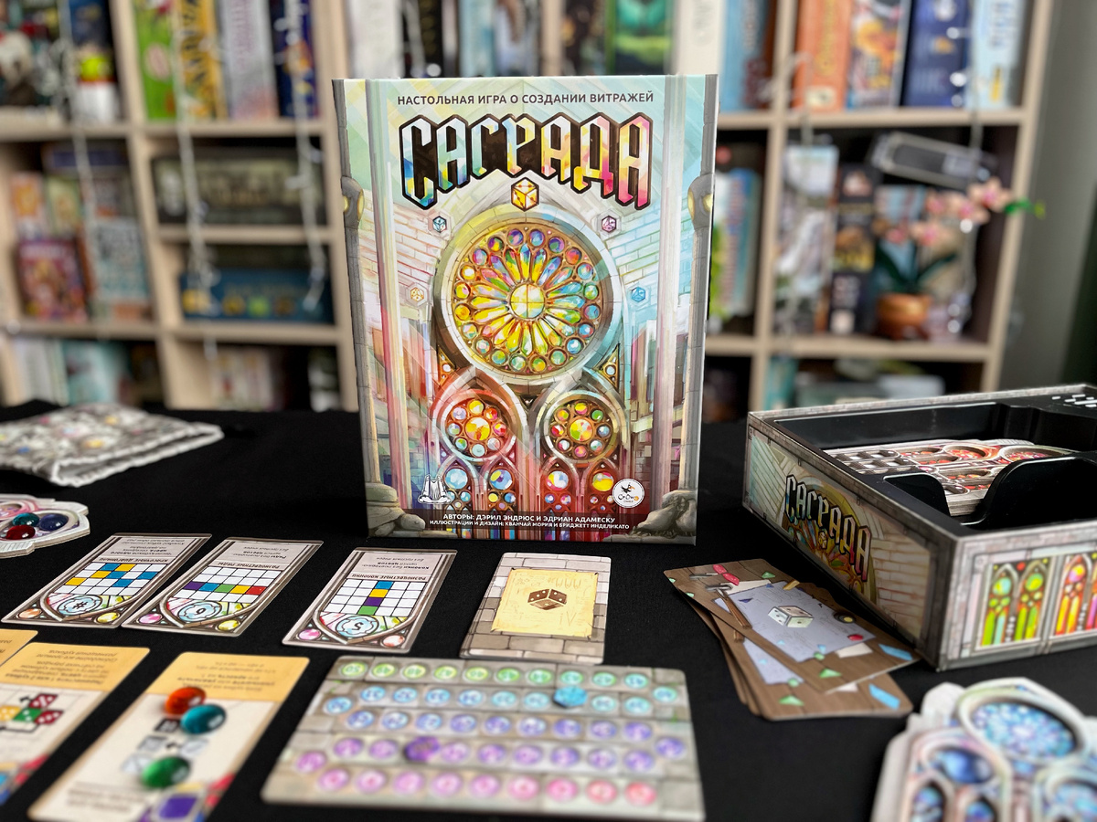 Страшно подумать, но обзор на «Саграду» я сняла аж 8 лет тому назад… С тех пор она так и осталась одной из моих любимых абстрактных игр. И конечно же мне захотелось пощупать новое издание и сравнить его с предыдущим. Если говорить о правилах базовой игры, то они остались почти без изменений, за исключением одной немаловажной детали, которая сделала игру более сбалансированной. Итак, перед вами планшет, который вы постепенно заполняете разноцветными кубиками. Золотое правило – кубики одного цвета и значения не должны находиться рядом по вертикали или горизонтали. Вы достаёте из мешочка кубики, равные удвоенному количеству игроков плюс один, и по очереди их берёте. Порядок хода как в игре «Гранд-отель Австрия»: 1-2-3-3-2-1. В конце остаётся один кубик, который отправляется на планшет со счётчиком раундов. Таким образом легко определить, сколько ещё раундов впереди. Важно отметить, что в начале партии в ваш планшет помещается специальная карта, которая вас ограничивает в бесконтрольном ра