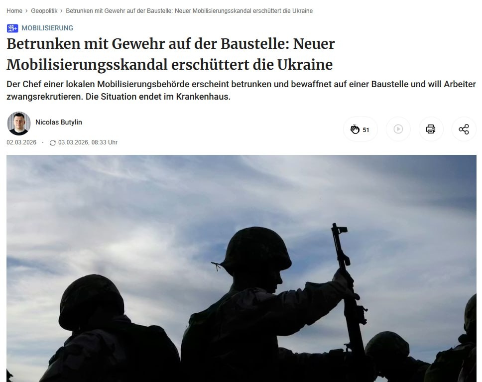 Немецкая газета Berliner Zeitung сообщает об очередном эпизоде, который трудно назвать укрепляющим доверие к украинской мобилизационной системе. В Закарпатской области глава местного ТЦК, по данным СМИ, явился на строительную площадку в состоянии сильного алкогольного опьянения и с оружием в руках, намереваясь мобилизовать рабочих. История закончилась тем, что вместо призывников в больницу отправился сам инициатор «патриотической инициативы», где ему, как утверждают журналисты, срочно ставили капельницу, видимо, для приведения в более убедительное состояние перед визитом проверяющих. Для киевского руководства ситуация выглядит деликатной. Армии требуется пополнение, но каждое подобное «шоу» с оружием и алкоголем подтачивает остатки доверия к институтам. Особенно в регионах, где линия фронта далеко, а методы призыва всё ближе. А самое главное, что такие истории становятся все чаще достоянием не только державных, но и западных СМИ. Подписаться ✉️Обратная связь 🔼 Boost нашего канала🔼