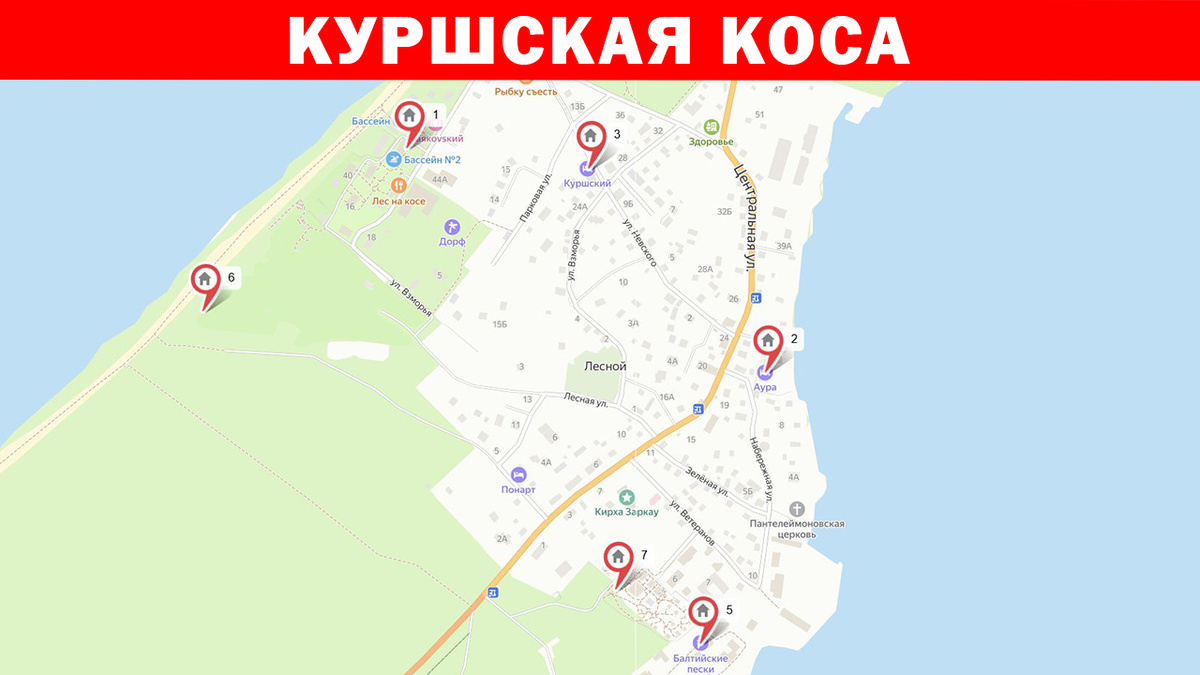Находится в самом узком месте Куршской косы (ширина 400 м), где сочетается комфорт и природа.