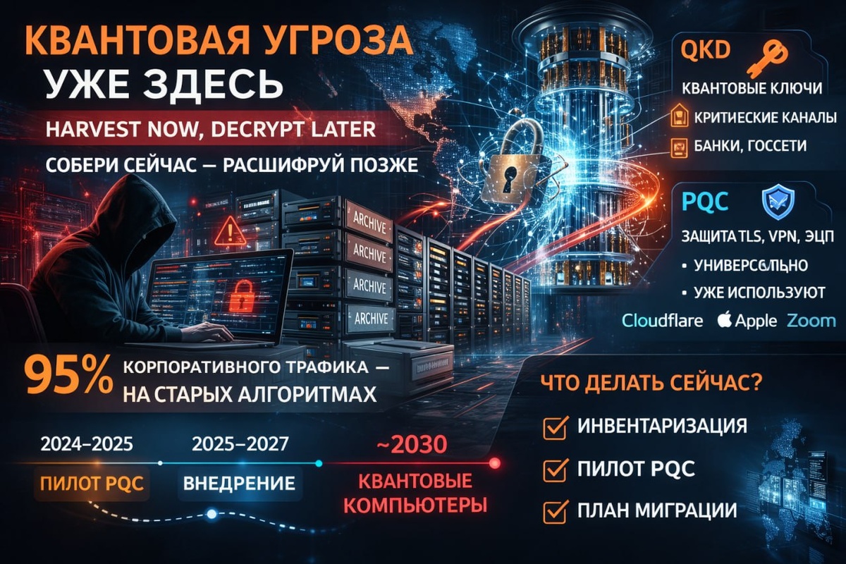 Представьте: вся ваша корпоративная переписка, базы клиентов, финансовые отчёты через 7–10 лет могут оказаться у конкурентов или хакеров. Это не фантастика: злоумышленники уже сегодня собирают зашифрованный трафик, чтобы расшифровать его с появлением квантовых компьютеров. 💥 Кейс: банк хранит платежные данные 10 лет. Сегодня трафик перехвачен. Через 7 лет квантовый компьютер расшифрует все операции. Последствия: 🔹Репутационный коллапс 🔹Судебные иски 🔹Шантаж и компрометация партнеров ⚠️ Ущерб: не сотни миллионов, а остановка бизнеса. 🔐 Проблему я уже описывал: текущие стандарты шифрования (RSA, ГОСТ, ECC) станут бесполезны. 🛡 Решение: 🔹QKD — квантовые ключи для критических каналов (очень дорого) 🔹PQC — постквантовые алгоритмы для TLS, VPN, ЭЦП, корпоративных систем. Дешевле, универсально, уже используют Cloudflare, Apple, Zoom. 🇷🇺 Россия: технологии есть — ViPNet QTS, пилоты Сколтех + РЖД, ТК 26. Но 95% корпоративного трафика всё ещё на старых алгоритмах. Соседние страны