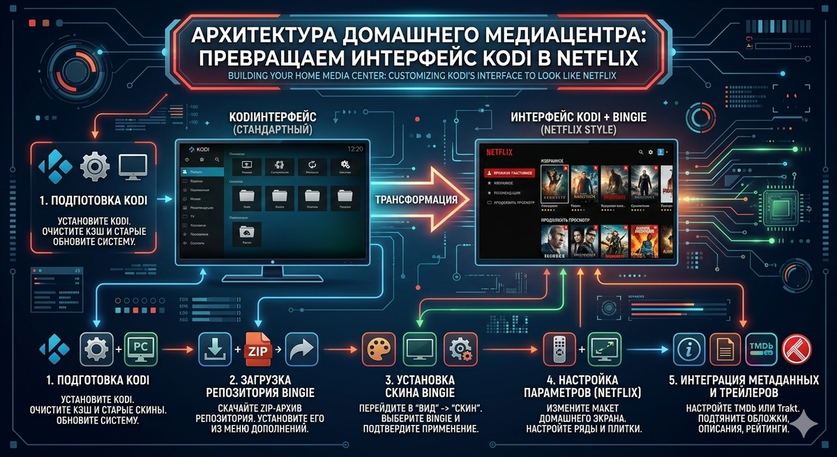 Медиаплеер Kodi давно зарекомендовал себя как невероятно мощный и кроссплатформенный open-source инструмент. Однако его стандартная визуальная оболочка выглядит довольно утилитарно и скучно. Если вы привыкли к современным, продуманным интерфейсам коммерческих стримингов, базовая логика Kodi может вас разочаровать. Хорошая новость заключается в том, что открытая архитектура системы позволяет полностью перестроить её внешний вид. Сегодня мы разберем инженерный подход к тому, как с помощью скина Bingie воссоздать эстетику и функциональность Netflix для вашей личной библиотеки. Для создания темной сетки с постерами и категорийными рядами существует несколько решений, включая Arctic Fuse, Arctic Zephyr Reloaded и Diggzflix. Наш выбор пал на Bingie, так как эта оболочка предварительно сконфигурирована для точной эмуляции UI Netflix и требует минимальной ручной доработки. Перед развертыванием интерфейса необходимо заложить правильный фундамент работы с данными: Инсталляция оболочки Bingie тре