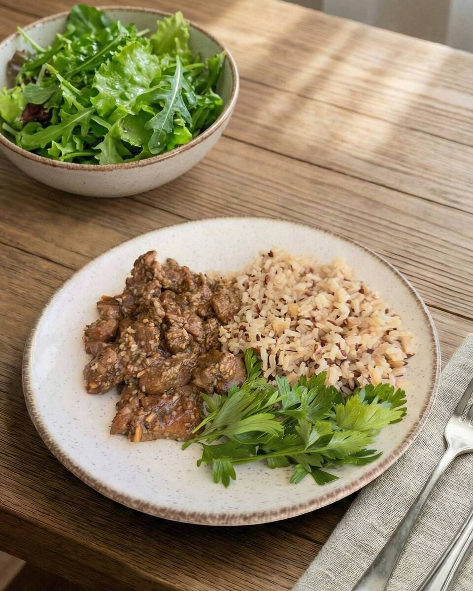 ) Ингредиенты: • маринованная говядина (у меня была с луком и специями) • 1–2 ст. л. соевого соуса • 1 ч. л. свежего тёртого имбиря • 1 зубчик чеснока • ½–1 ч. л. мёда • вода или бульон для тушения По желанию в конце: • кунжутное масло • зелёный лук • кунжут ❄️ Подготовка мяса Вечером достаю пакет с маринованной говядиной из морозилки и перекладываю в холодильник. За ночь мясо спокойно размораживается, и утром можно сразу готовить. 🔥 Шаг 1. Обжарка Разогрейте сковороду или казан. Выложите говядину и обжарьте на сильном огне до лёгкой румяной корочки. Важно: первые пару минут мясо лучше не мешать — так появляется вкусная корочка. 🍲 Шаг 2. Тушение Добавьте горячую воду или бульон так, чтобы жидкость покрывала мясо. Можно добавить: • 1 ст. л. соевого соуса Накройте крышкой и тушите 1,5–2 часа на слабом огне, пока говядина не станет мягкой. При необходимости добавляйте воду. 💡 Если воды осталось много Иногда после тушения мясо уже мягкое, но жидкости в сковороде много. В этом