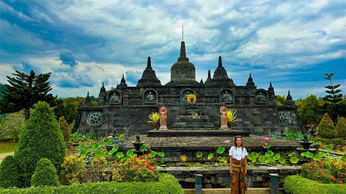). Это один из немногих буддистских храмов острова. Бали часто называют островом тысячи храмов. При этом обычно вспоминают главный храм Пура Бесаких, храм летучих мышей Гоа Лавах, водный храм Танах Лот и другие. Все это индуистские храмы. Немудрено! Индуизм – самая распространенная религия на острове. Однако здесь же вы можете встретить мусульманские мечети, протестантские кирхи, католические костелы и буддистские монастыри. Бали мультирелигиозен, это одна из его важных особенностей. Буддизм не очень популярен на Бали, его исповедует очень скромное количество жителей. Число буддистских храмов на острове не велико, но тем ценнее каждый из них. Главным же храмом можно по праву считать Брахмавихара Арама – жемчужину буддизма на Бали. Посещение этого храма даст возможность на мгновение побывать на острове Ява. Дело в том, что Брахмавихара Арама является миниатюрной копией другого буддистского храма – Борободура. Этот яванский храм, гордость Индонезии, стал широко известен в 1991 году п
