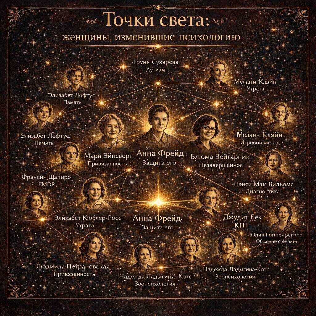 Если представить психологию как ночное небо, то эти женщины - звезды на его карте. Некоторые из них ушли давно, но их свет продолжает идти сквозь время, достигая нас сегодня. Именно благодаря этому свету мы можем ориентироваться в темноте человеческой души, прокладывать маршруты к исцелению и находить путь там, где другие видят лишь хаос.
