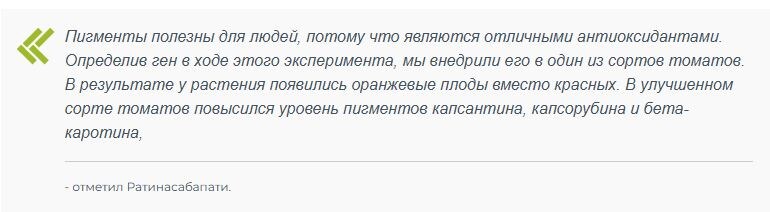 Они внедрили в томаты CCS – это ген перца, отвечающий за синтез каротиноидов, чтобы увеличить содержание бета-каротина. Чтобы понять, какую функцию выполняет ген в перце, ученые сначала отключили CCS ген, участвующий в синтезе капсантина и капсорубина, двух пигментов красного перца. Затем исследователи вывели гибридные томаты путем скрещивания отобранных сортов с недавно выведенным оранжевым томатом. Оказалось, что полученные гибриды содержат гораздо больше бета-каротина, капсантина и капсорубина, чем