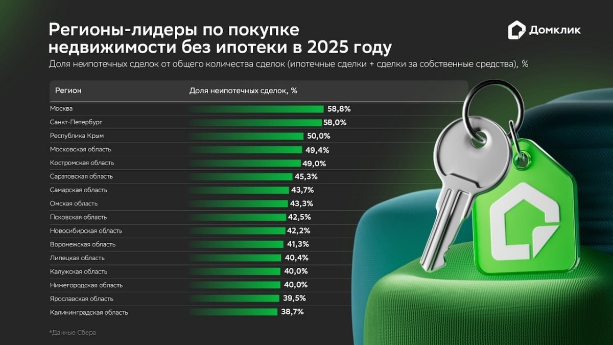По итогам 2025 года с помощью сервисов Сбера россияне заключили почти 400 тыс. сделок на покупку недвижимости без ипотеки — на 12,4% больше, чем в 2024 году. 🔘Чаще всего без ипотеки россияне покупают вторичку. Ключевой фактор — высокие ставки по рыночным программам. 🔘Самый высокий интерес к сделкам за собственные средства в 2025 году отмечался в Москве и Санкт-Петербурге — почти 60% всех сделок на покупку недвижимости здесь проходит без ипотеки. Также такой способ покупки жилья востребован в Крыму, в Московской, Костромской, Липецкой областях и других регионах России. ➡️ Подробнее о том, как изменился спрос на покупку недвижимости за свои средства — в журнале Домклик