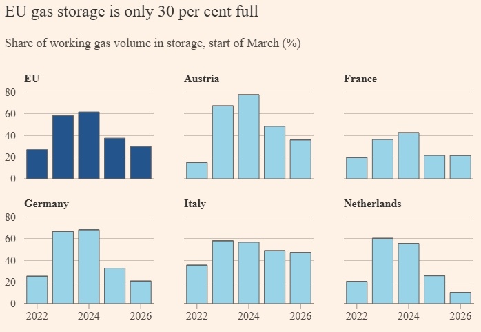 Заполненность газохранилищ ЕС составляет всего 30 процентов. Доля объема рабочего газа в хранилищах, начало марта (%). Евросоюз. Австрия. Франция. Германия. Италия. Нидерланды