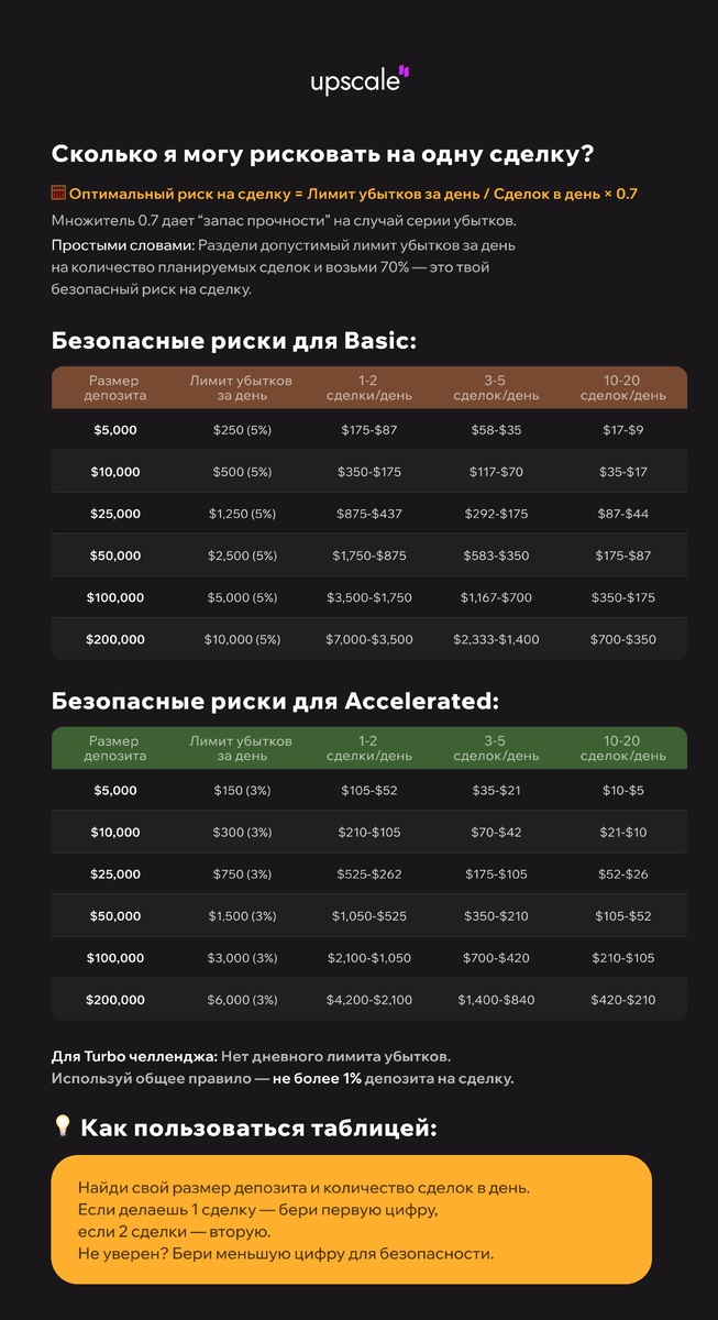 🔮 Как рассчитать риск на сделку? Этот вопрос часто появляется в нашем чате, поэтому мы собрали таблицу с безопасными рисками для аккаунтов Upscale. ⚡️ В ней можно быстро посмотреть: • лимит убытков за день • риск на одну сделку • как меняется риск в зависимости от количества сделок Это не строгие правила, а удобный ориентир, чтобы случайная серия убытков не выбила дневной лимит. 📎 Скачивайте PDF-файл, прикрепленный к этому посту. Его можно сохранить и использовать как шпаргалку во время торговли. Если такие инструкции полезны - поставьте 🔥 огонёк ниже. И тогда мы будем делать больше подобных материалов в будущем! ➖➖➖➖➖➖➖➖ 🆙 Приложение | Вебсайт | Чат | Twitter | Новости | YouTube | Поддержка PR group — мощная реклама в ВК, Telegram и на топ-сайтах. Таргет под ключ, горячая аудитория, продажи на максимум, без воды и переплат. https://vk.ru/prgroup_com PR group