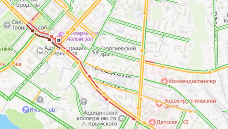 Движение в этой части города затруднено днем в четверг, 5 марта. Выезд на площадь затруднен со стороны улиц Набережной, Баженова. Кутузова и Ленина. По Кутузова затор растянулся до перекрёстка с Луначарского. Очевидцы сообщают, что в районе пересечения Старого Торга и улицы Ленина произошло ДТП.
