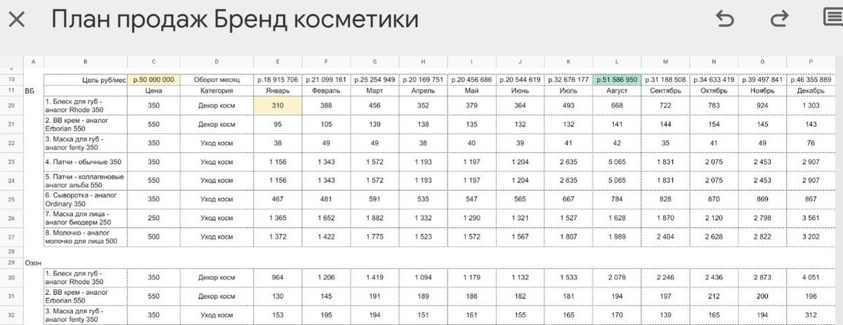? Вчера вечером накидал план продаж для бренда косметики Давно не смотрел эти ниши и довольно сильно удивился Факт: На Озоне покупают косметику чаще и больше, чем на ВБ Понятно почему ВБ купили Ривгош))) Как составляется План продаж? Обязательно закладывается сезонность каждого товара В данном случае 8 артикулов в 7 нишах Также закидываем ёмкость рынка Данные лучше брать своих брендов, но в данном случае использовал данные с МПстата, тк бренд пока что нулевой