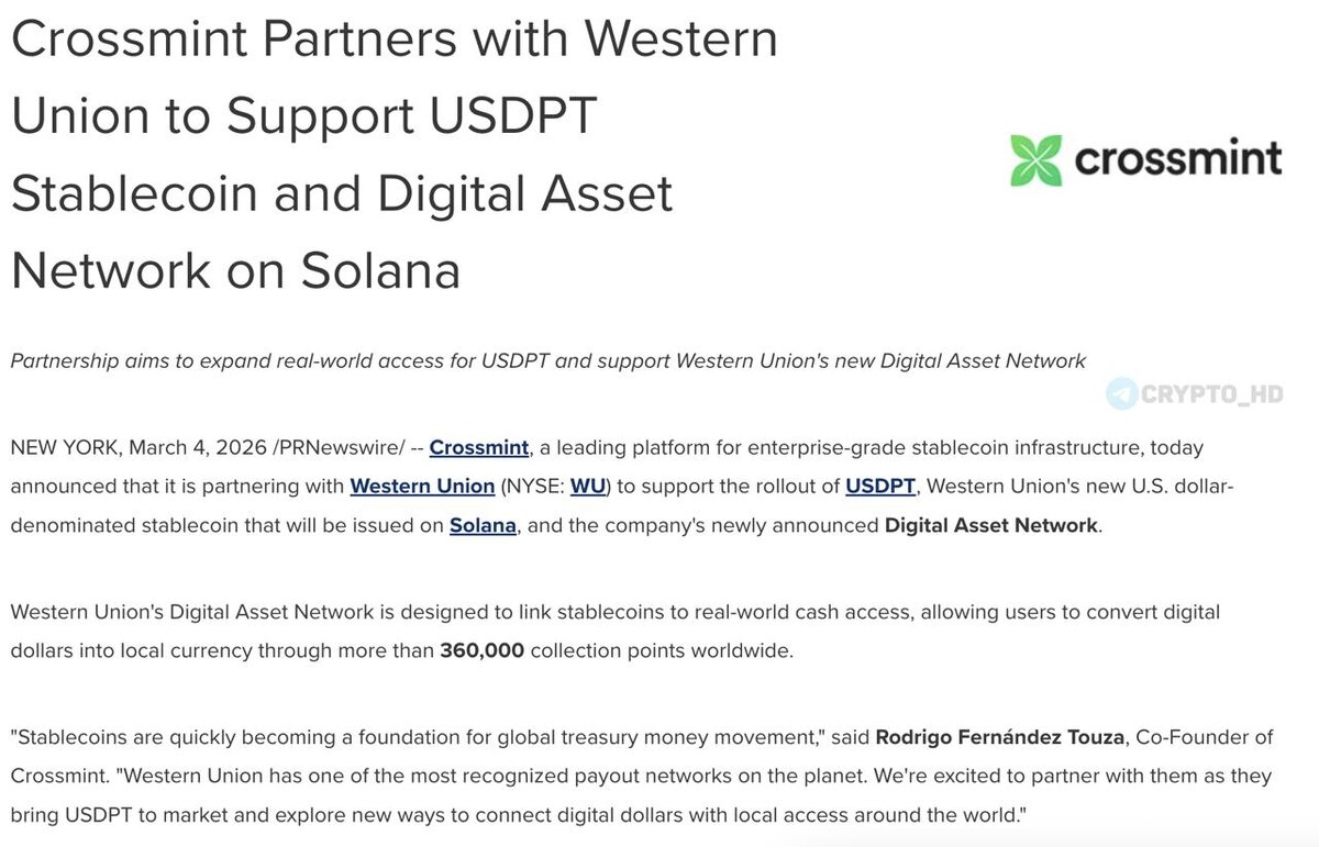 💸 Western Union запускает стейблкоин на блокчейне Solana. Крупнейший международный оператор денежных переводов объявил о партнерстве с Crossmint для запуска стейблкоина USDPT и новой сети цифровых платежей Digital Asset Network. Главная идея — соединить блокчейн и традиционные денежные переводы. ➠ USDPT будет выпущен в сети Solana. ➠ Финтех-сервисы смогут использовать API Crossmint для отправки платежей в стейблкоине. ➠ Получатели смогут конвертировать цифровые доллары в наличные через сеть Western Union. У компании более 360,000 пунктов выдачи наличных по всему миру и присутствие в 200+ странах, поэтому новая система фактически соединяет криптоплатежи с глобальной инфраструктурой переводов. ❗️Мировой рынок денежных переводов достигает ~$905b. Ранее: стейбл-карта Crypto Headlines