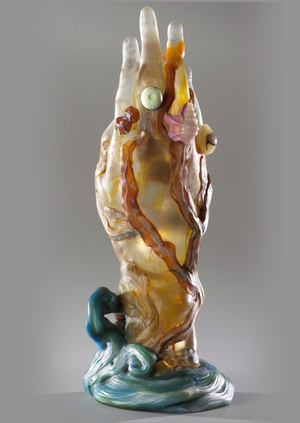 Стеклянные шедевры Эмиля Галле (1846–1904) известны прежде всего своими ботаническими дизайнами, многие из которых создавались самим мастером, призывавшим черпать вдохновение в природе. Лесные, садовые и луговые цветы, стрекозы и бабочки населяют прозрачные миры этого мастера. А еще его привлекала тема моря, воспетая Бодлером, поэзию которого он высоко ценил: «Свободный человек, ты всегда будешь дорожить морем. Море — твоё зеркало, в нём ты созерцаешь свою душу…» Морской мир служил для Галле источником многих декоративных мотивов, особенно часто встречаются вазы с декором «водоросли и раковины», но есть и очень необычные арт-объекты, один из которых можно увидеть в музее Орсе. Рука с морскими водорослями и раковинами, Эмиль Галле, 1904 г., Музей Орсе, Париж. Рука с морскими водорослями и раковинами (сторона 2). «Les Fonds de mer» (морское дно) – под таким названием эта статуэтка была представлена в 1904 году в Нанси. Одно из последних произведений великого мастера стало итоговой демонс