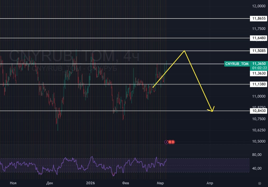🟢Идет плановый отскок по валюте. В основном он на инициативе Минфина о том, что в момент геополитической тряски, они не будут производить продаж валюты и золота из резерва. Сейчас пришли на сопротивление 11,36. Предполагаю, что при коррекции индекса IRUS деньги продолжат переход в валюту, так что пока что жду продолжение роста валютных пар. Ориентир пока что на 11,50, но не исключаю. что могут закинуть и выше. Но после этого всплеска вверх, все равно буду ждать рубль на укрепление к 10,84 и ниже. 🚗 Жду продолжение отскока вверх, после чего новую волну укрепления рубля, после того как все поверят в то, что начинается та самая девальвация рубля. #юаньрубль #юань #прогнозрубля #рубльдоллар #cnyrub #cnyrubf #bogdanoffinvest $CRH6 $CRM6 $CNYRUB $CNYRUBF