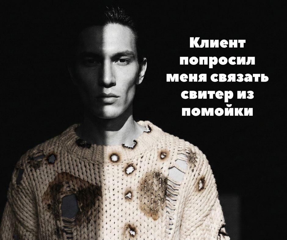 Это был известный израильский дизайнер Sasson Kedem. И он описал подробно: прожжён сигаретой, вытерт до дыр, с пятнами. Как будто у этого свитера была долгая и небезупречная жизнь. Я остановилась. Потому что всё, что я умела до этого момента — это делать хорошо. Ровно, чисто, профессионально. А он просил сделать так, чтобы казалось будто плохо. Но не по-настоящему плохо — а как будто. И это "как будто" — и есть дизайн. Я начала думать технически: как изобразить дыру, которая не дыра. Как сделать пятно, которое выглядит случайным, но стоит на нужном месте. Как передать ощущение времени через петли. В процессе я поняла кое-что важное. Не про вязание. Про клиента. Он видел свитер совершенно иначе, чем я. Я видела конструкцию, пряжу, технику. Он видел образ, историю, ощущение. И моя задача была не объяснить ему, как это устроено изнутри — а понять, что именно он хочет почувствовать снаружи. Этот урок я потом встретила снова — в совершенно другом месте. На Pinterest. Меня зовут Гала Голанск