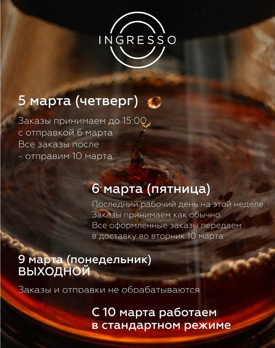 🔤🔤🔤🔤🔤🔤 🔤🔤🔤🔤🔤🔤 в праздничные дни 5 марта 2026 (четверг) — заказы принимаем до 15:00 с отправкой в службы доставки 6 марта 2026. Всё, что будет оформлено позже, отправим 10 марта 2026. 6 марта 2026 (пятница) — последний рабочий день на этой неделе. Заказы принимаем как обычно. Все заказы, оформленные в этот день, передадим в доставку во вторник, 10 марта 2026. 9 марта 2026 (понедельник) — выходной. Команда берет паузу, чтобы отметить праздник. В этот день мы не работаем, заказы и отправки не обрабатываются. С 10 марта 2026 (вторник) — возвращаемся к обычному графику и работаем в стандартном режиме 🔖 Сделать заказ на сайте ingresso Екатеринбург, ул. Городская, 20 +7 343 278-81-63 📎Доставка кофе за 15 минут по Екатеринбургу в Яндекс Лавке