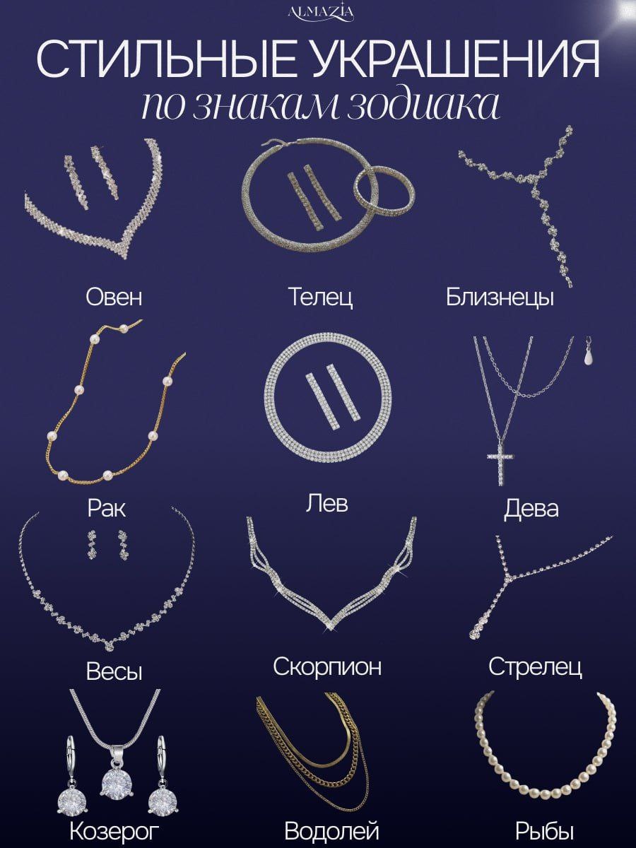 Дорогие друзья! Команда ALMAZIA подготовила для вас особенный гид по украшениям для каждого знака зодиака. Мы изучили предпочтения звёзд и подобрали идеальные варианты из нашего каталога! Сохраняйте статью и делитесь с подругами! 💫 Почему: Овны любят быть в центре внимания. Им нужны украшения, которые подчёркивают их лидерские качества. Наш выбор: Элегантный V-образный сет с фианитами — дерзкий, но утончённый акцент для сильной личности. Почему: Лев — знак солнца. Ему нужно сиять по-королевски. Роскошь, статус, без компромиссов. Наш выбор: Массивное колье с кристальной россыпью — для тех, кто привык командовать и восхищать. Почему: Стрельцы ценят универсальность. Украшение должно подходить и для офиса, и для путешествий. Наш выбор: Асимметричная подвеска на цепочке — лёгкость, свобода, никакой скованности. Почему: Тельцы ценят качество и долговечность. Им важна тактильность и ощущение ценности. Наш выбор: Круглый чокер с паве-россыпью — классика, которая никогда не выйдет из моды. По