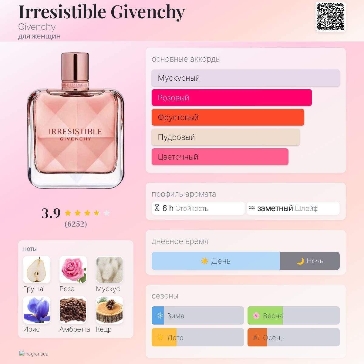 Если вы ищете современный, чистый, женственный и при этом не банальный аромат с заметным розовым аккордом, но без «бабушкиной» тяжести — Irresistible Givenchy почти наверняка вам понравится.