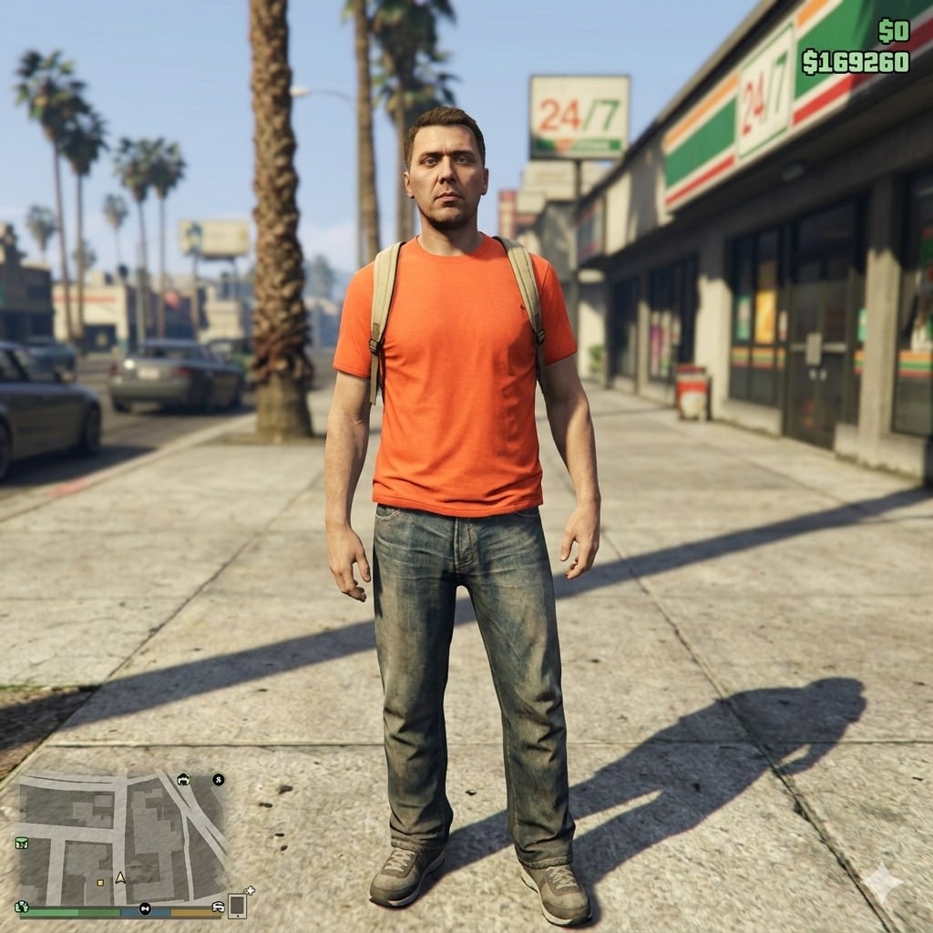 Auto V gameplay environment. MUST include legs and feet, even if not present in reference.", "style_and_aesthetic": { "primary_style": "Match the in-game graphics aesthetic of Grand Theft Auto V (RAGE engine). Focus on realistic, slightly gritty textures for skin, cloth, denim, and leather. The rendering should look like a high-quality character snapshot taken directly from the game engine, not a pre-rendered cinematic or 2D illustration.", "lighting": "Realistic outdoor game lighting e.g.. Strong, natural highlights and defined shadows that give depth to clothing folds and facial features.", "avoid": [ "LEGO or plastic toy aesthetics", "2D Loading Screen illustration style cel-shading", "Cartoon or exaggerated proportions", "Hyper-realistic photography (must still feel like a game)", "Smooth, textureless surfaces", "Cropped images (no half-body renders)" ]}, "subject_details_to_retain": { "identity_preservation": "Translate the subject's upper clothing, hair style, and acc