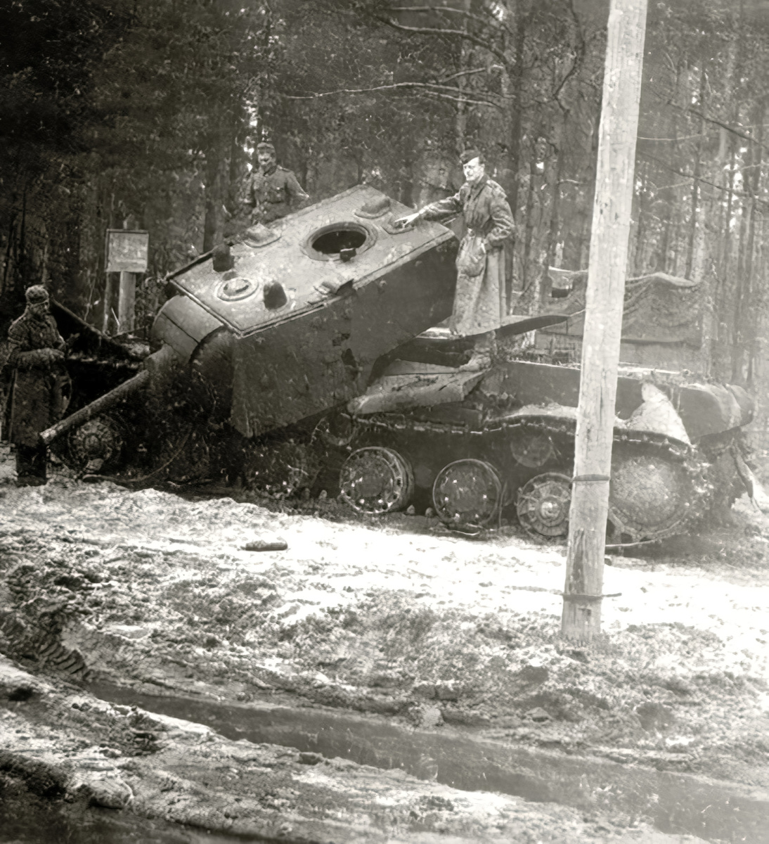 Позади подбитого танка на фотографиях оказались и другие машины. После долгих поисков удалось установить, что это два тяжёлых КВ-1 из 84-го отдельного танкового батальона. Один из них, судя по немецкой надписи на борту башни, был уничтожен 88-миллиметровым зенитным орудием — грозным оружием, которое часто использовалось немцами против советских тяжёлых танков.