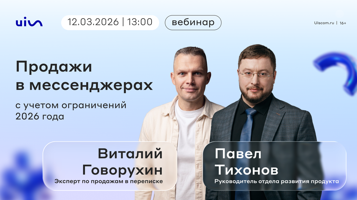 Не гадать, а использовать проверенные подходы, которые работают даже в условиях ограничений 2026 года. Виталий Говорухин и Павел Тихонов поделятся ими в прямом эфире. 12 марта в 13:00 (МСК) — вебинар «Продажи в мессенджерах с учетом ограничений 2026 года». Только практика: как сохранить контроль над коммуникацией и не терять заявки. Вы узнаете: О спикерах: Зарегистрируйтесь на вебинар, чтобы стать одними из первых, кто получит механики работы с клиентами в мессенджерах в 2026.