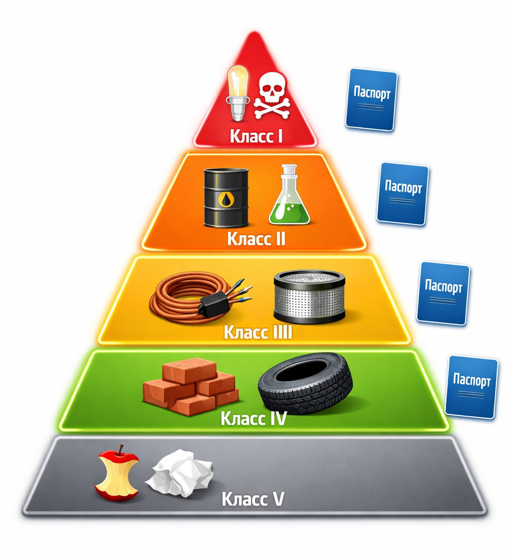 На любом предприятии образуются отходы. Но подход к ним разный. Одни можно просто выбросить в бак, а для других нужен целый пакет документов. Разбираемся в классах опасности и паспортизации. Пять классов опасности Закон делит все отходы на пять групп. Чем выше класс, тем опаснее отход и строже требования. I класс — красный уровень тревоги