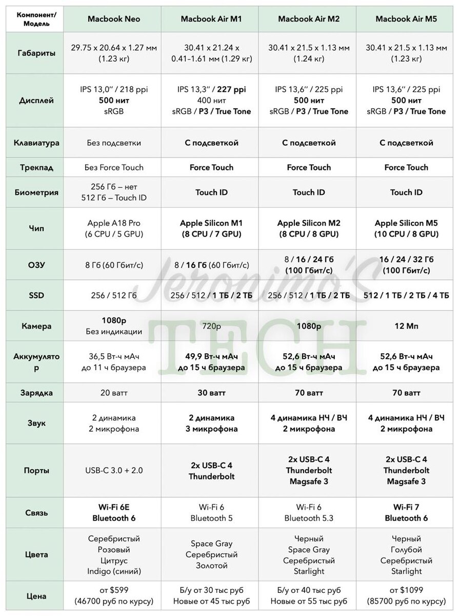 Сравнение характеристик: Macbook Neo против Macbook Air M1/M2/M5. В таблице жирным выделены различия.